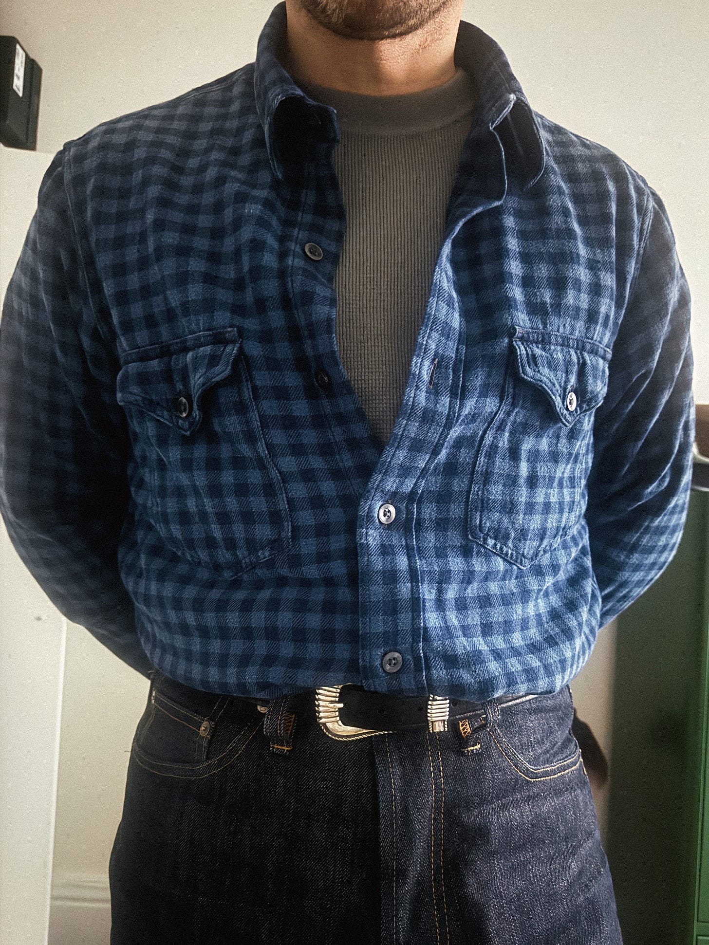 All that to say, this midweight flannel I picked up in California is cut like a classic work shirt and pulls details from ‘40s U.S. Navy shirts, all with brushed indigo-dyed cotton that looks even better after I washed it.