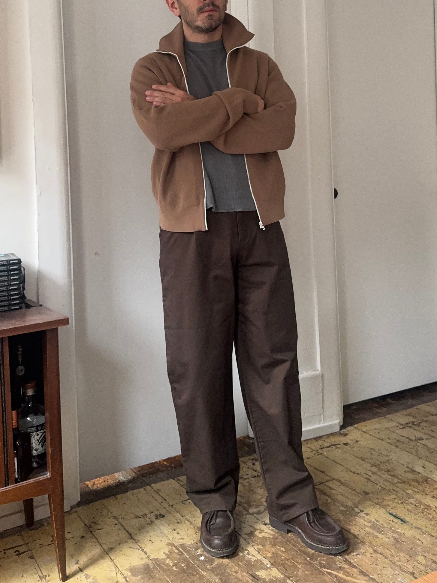 Keeping the brown theme going, I picked up the collection’s 100% cotton twill barrel pants. I wasn’t totally sold on the barrel shape at first—it’s got that rounded, roomy leg that narrows slightly at the hem. Was it too trendy? Once I threw it on with the zip-up, it made complete sense.